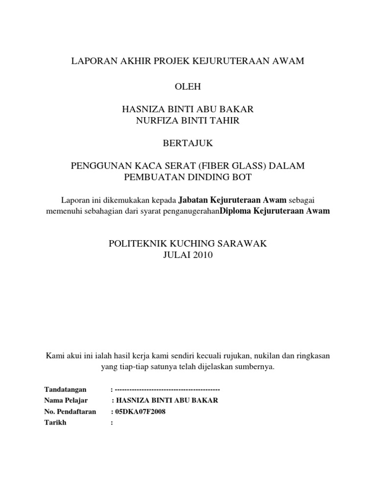 Contoh Laporan Akhir Projek Kejuruteraan Awam Contoh Laporan Projek Tahun Akhir JKA JKA MODUL BARU JKA MODUL LAMA nota statistik Laporan Akhir Projek Kejuruteraan Awam Oleh Hasniza Binti Abu Bakar Nurfiza Binti Tahir Bertajuk Penggunan Kaca Serat Fiber Glass Dalam Pembuatan Dinding Bot. Laporan ini dikemukakan kepada Jabatan Kejuruteraan Awam di Politeknik Sultan Mizan Zainal Abidin sebagai memenuhi sebahagian syarat penganugerahan Diploma Kejuruteraan Awam. Contoh laporan projek akhir mekanikal politeknik.